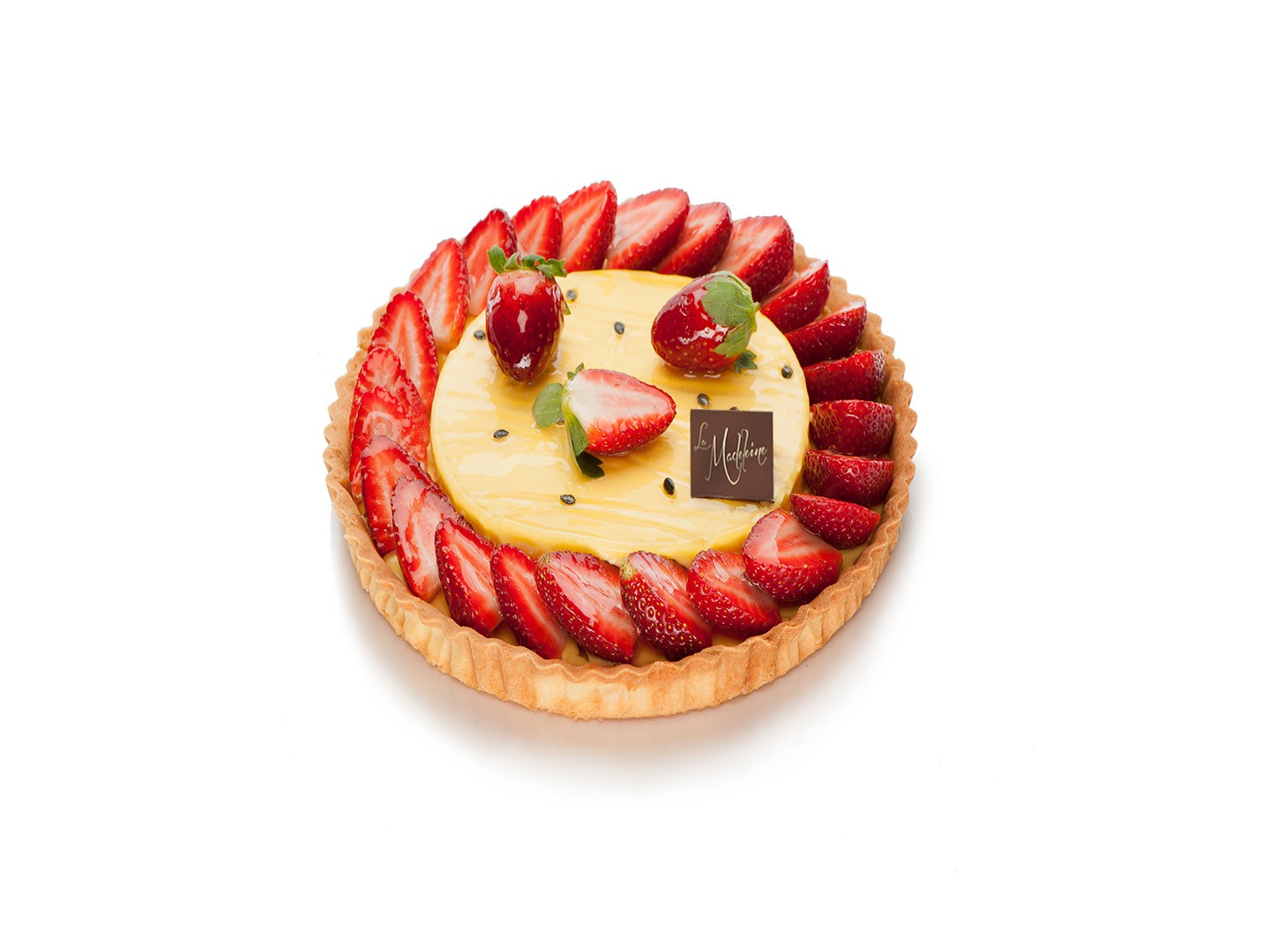 Mango Passion Custard, Fresh Strawberry with an Almond Base